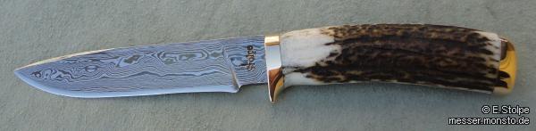 Beschreibung: Damast-Jagdnicker mit Rothirschgriff und Bonzemontur Klinge: 118mm; 200 Lagen aus 1.3505 und Kanonenrohrstahl Gewicht: 180g